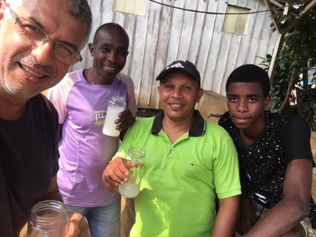 Hoje, de manhã, o Carlos, meu anfitrião aqui, levou-me para visitar sua lavoura de pimenta do reino. Ficamos três horas pelo interior. Para começar, ele me levou para beber, junto com uns amigos da comunidade onde nasceu, vizinha ao hotel, o oinho de palma, uma bebida obtida a partir da fermentação da seiva de várias espécies de palmeiras e coqueiros. Tomei a que havia sido feita de manhã cedo, estava mais para um suco fermentado, com os dias torna-se uma bebida alcoólica.