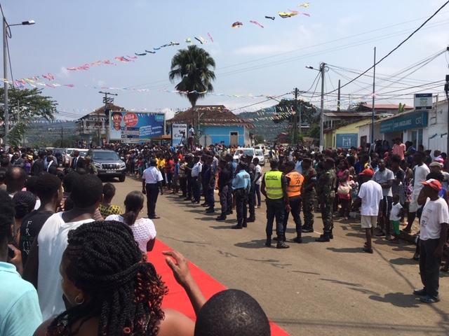 Depois de trinta minutos dirigindo cheguei a Caué, importante município da ilha. Mas não pude seguir viagem… a comemoração principal do aniversário da independência do país era nessa cidade, naquele exato momento, com a presença da Comitiva Presidencial. O que me restou foi estacionar o carro e ver a movimentação. Não cheguei a tempo dos discursos, o que não achei ruim, mas pude ver muita gente nas ruas, roupas domingueiras e clima de festa. Música e barraquinhas de comida. Legal ter visto. Na volta vi um animado baile no meio da rua.